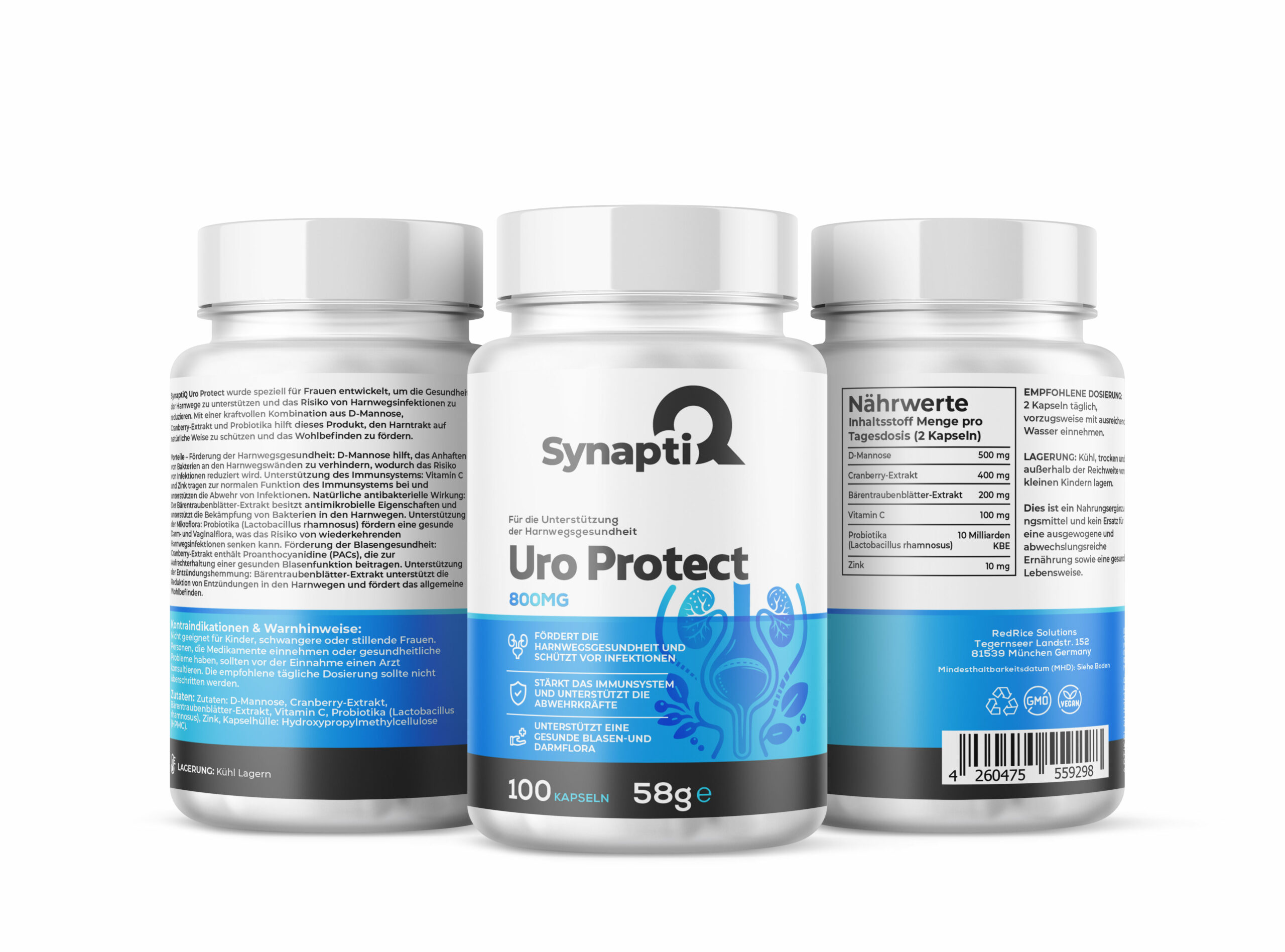 SynaptiQ Uro Protect wurde speziell für Frauen entwickelt, um die Gesundheit der Harnwege zu unterstützen und das Risiko von Harnwegsinfektionen zu reduzieren. Mit einer kraftvollen Kombination aus D-Mannose, Cranberry-Extrakt und Probiotika hilft dieses Produkt, den Harntrakt auf natürliche Weise zu schützen und das Wohlbefinden zu fördern.